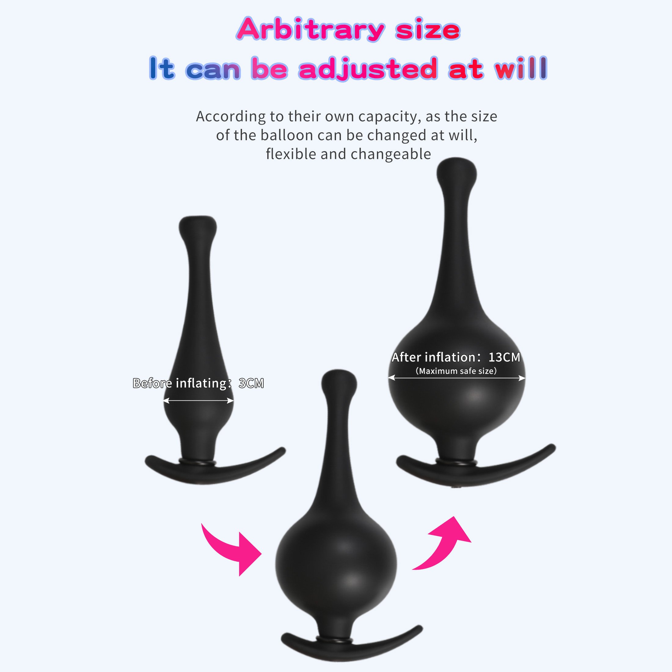 Material:Silicone Colors:Black Style : Adjustable Inflated biggest size is 13cm. Include: 1pc * inflatable anal plug package:discreet package,protect your privacy